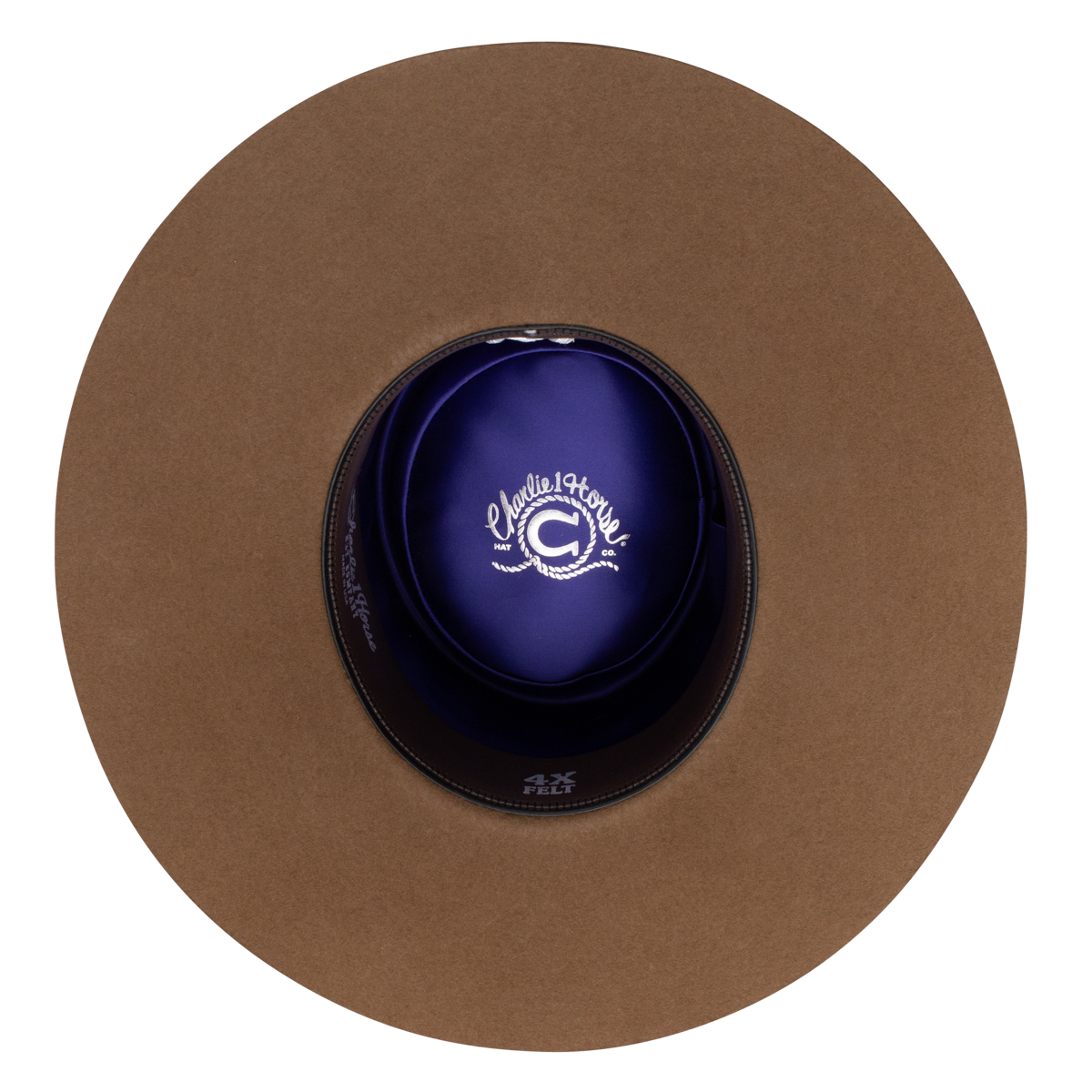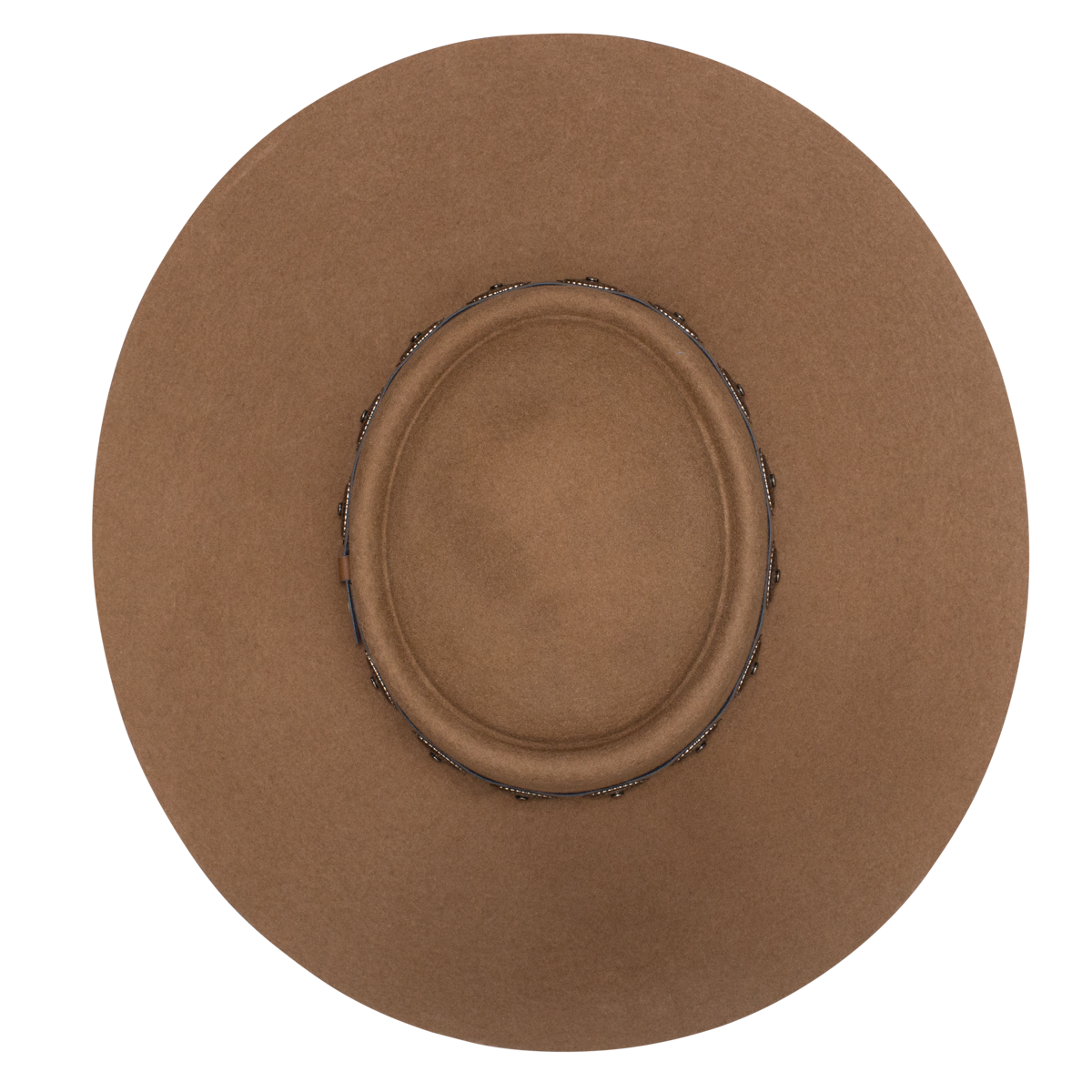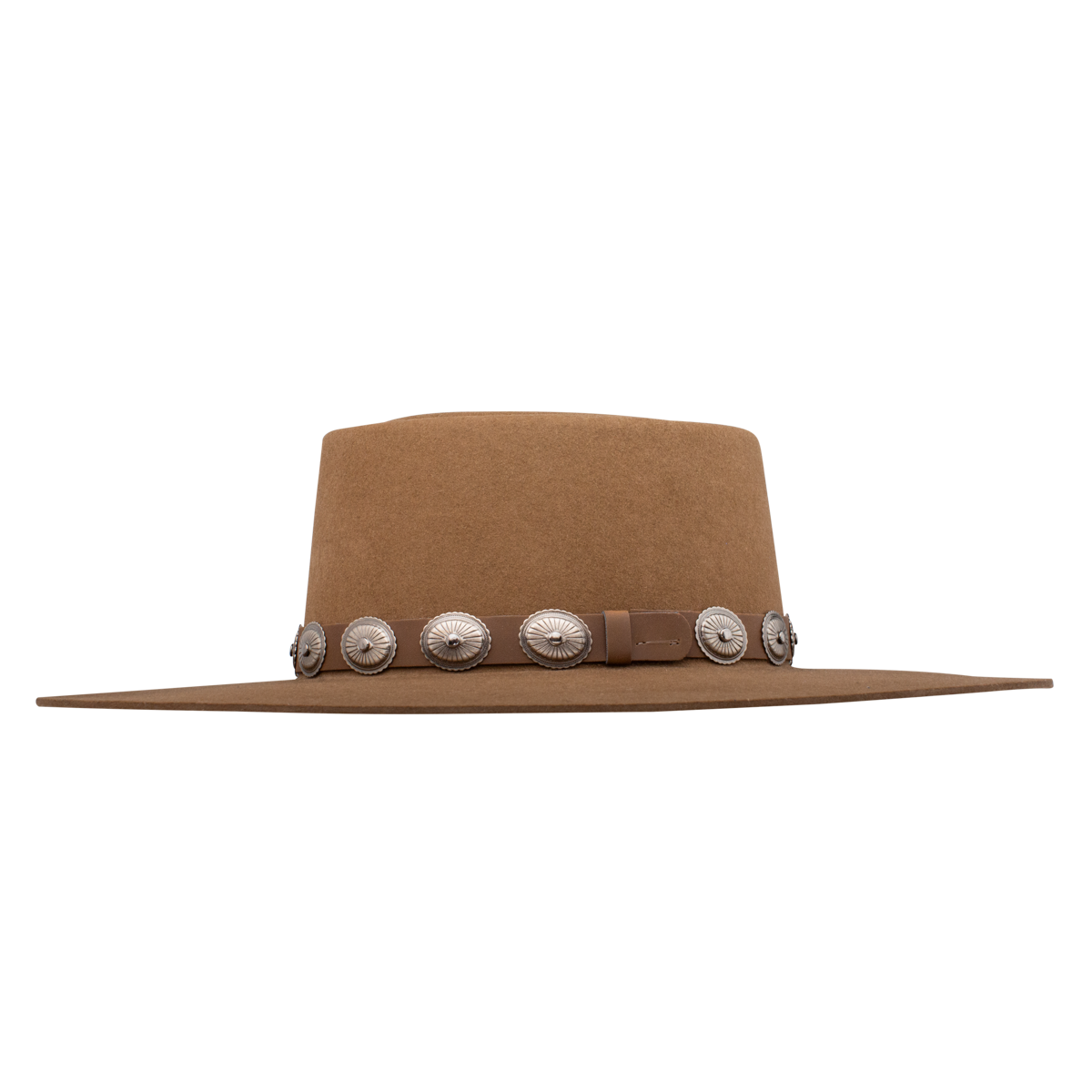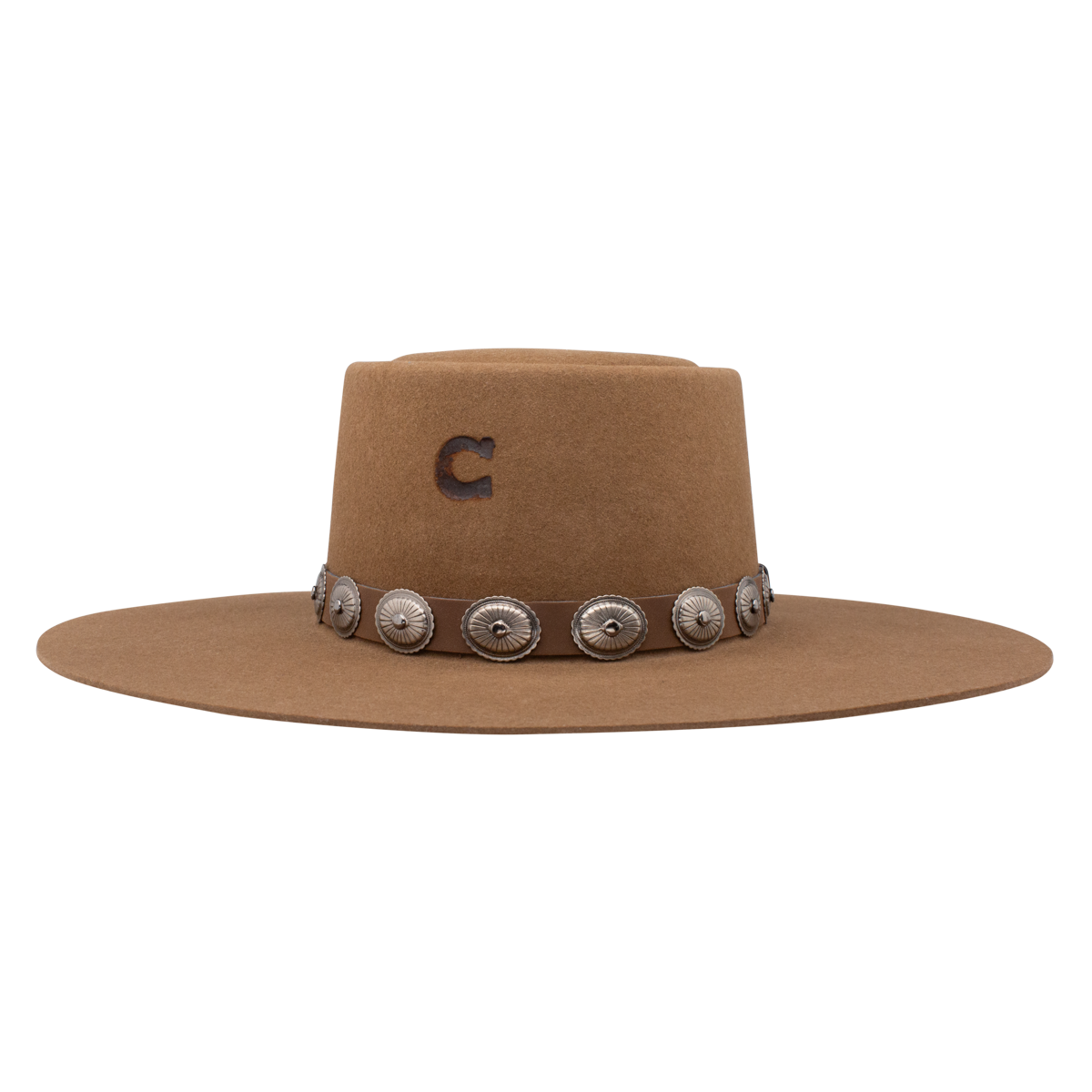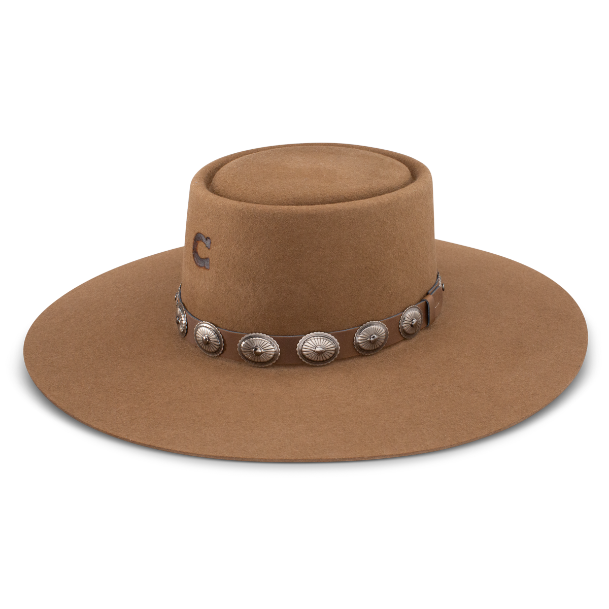 From Saint George, Utah to the Las Vegas Strip, the High Desert in Pecan stands at the apex of cowgirl chic. This knockout of a wool hat has a 4 1/8” telescope crown, a 4 1/4" brim, and a bonded leather sweatband that can stand up to the Mohave itself. The High Desert’s tan hatband is accented by silver wagon-wheel conchos, while a demure Charlie 1 Horse logo adorns the crown. Part of our Wild West Collection, the High Desert is a contemporary interpretation of the shapes, textures, and hues of the past.