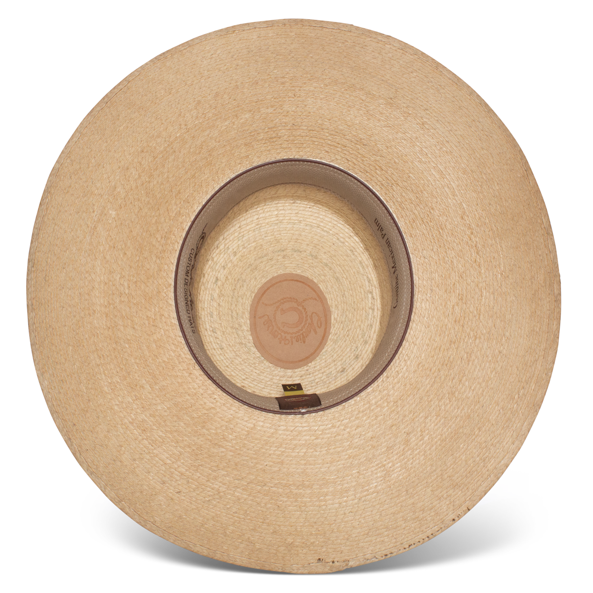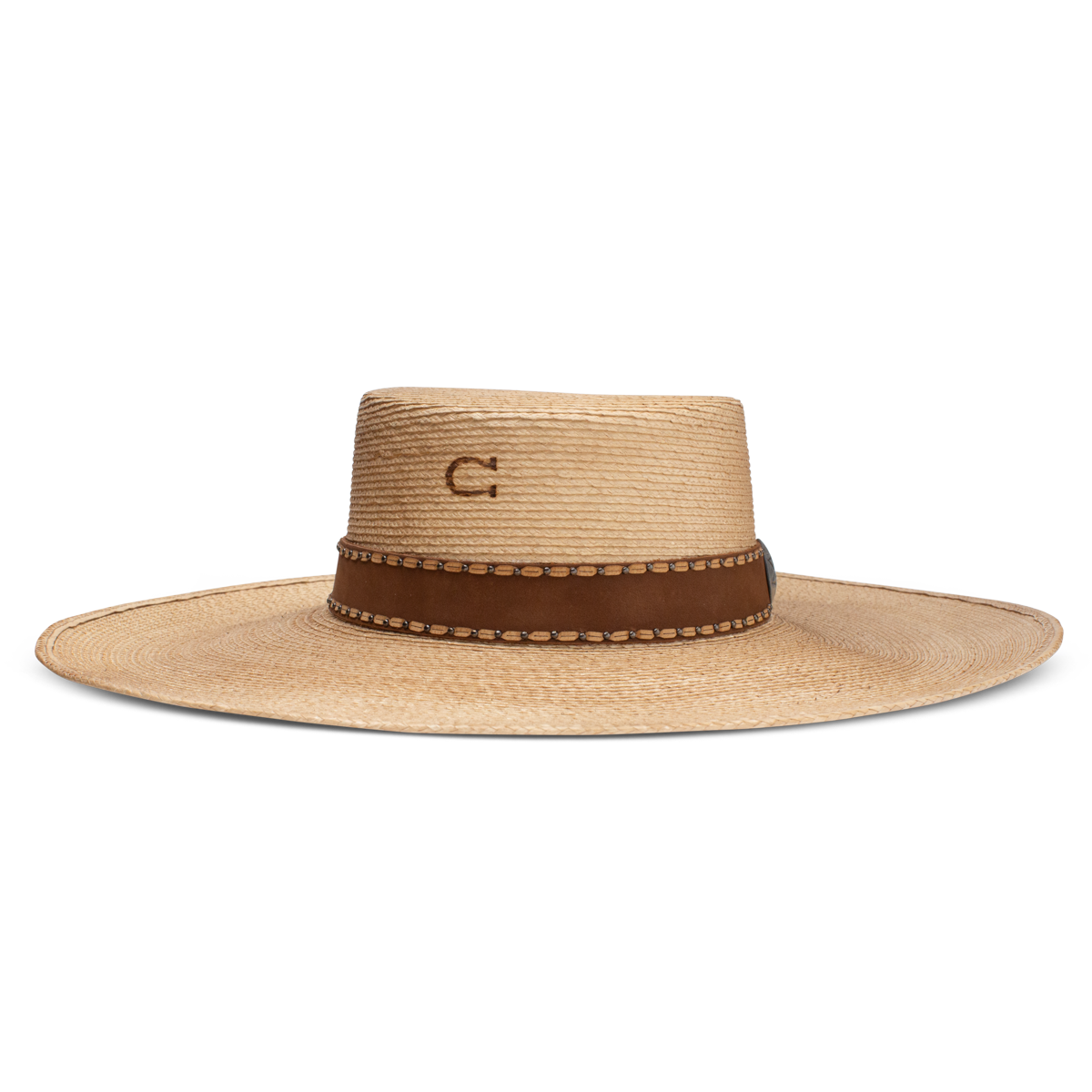 Wide brimmed with a dashing telescope crown, the Vaquera suggests warm weather, shady plazas, and the energetic hustle and bustle of Old Mexico on market day. This palm hat offers a 4” telescope crown, a 5” brim, and a cloth sweatband to see you through to siesta time. The brown hatband with tan stitch work is accented by nail heads and a circular metal concho featuring a solar design. The Vaquera is part of the Charlie 1 Horse Wild West Collection, where we strive for timeless Western looks with a contemporary feel.