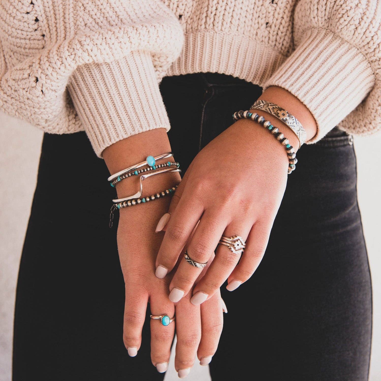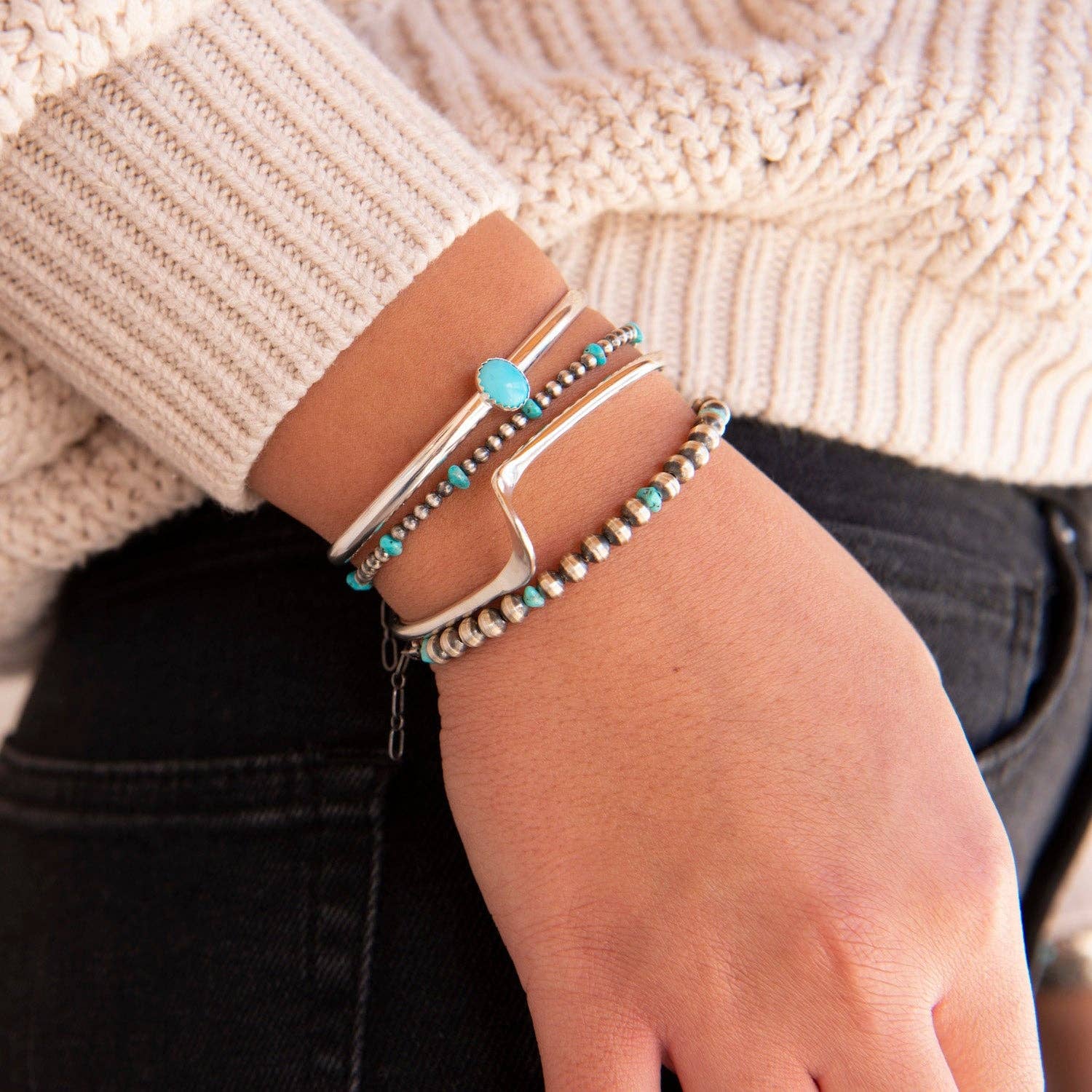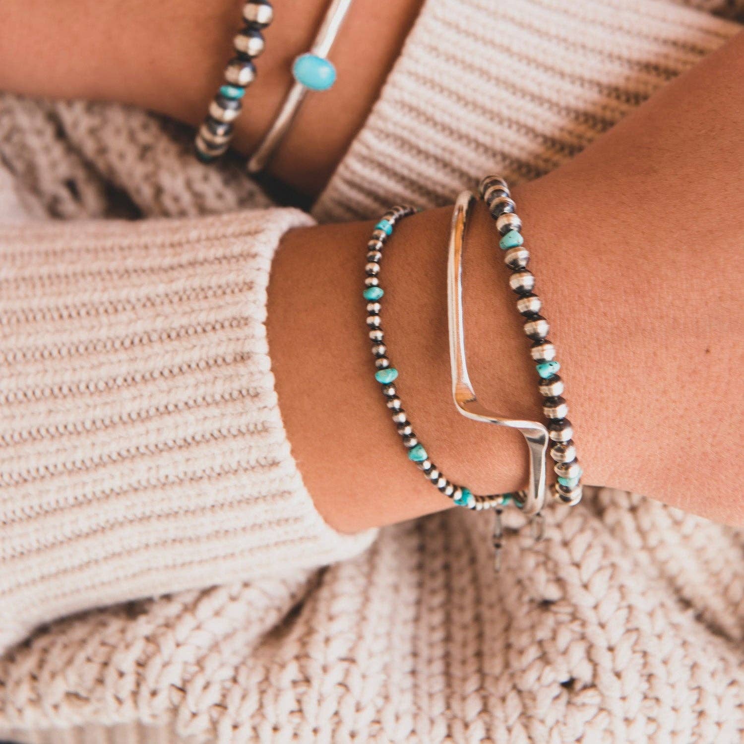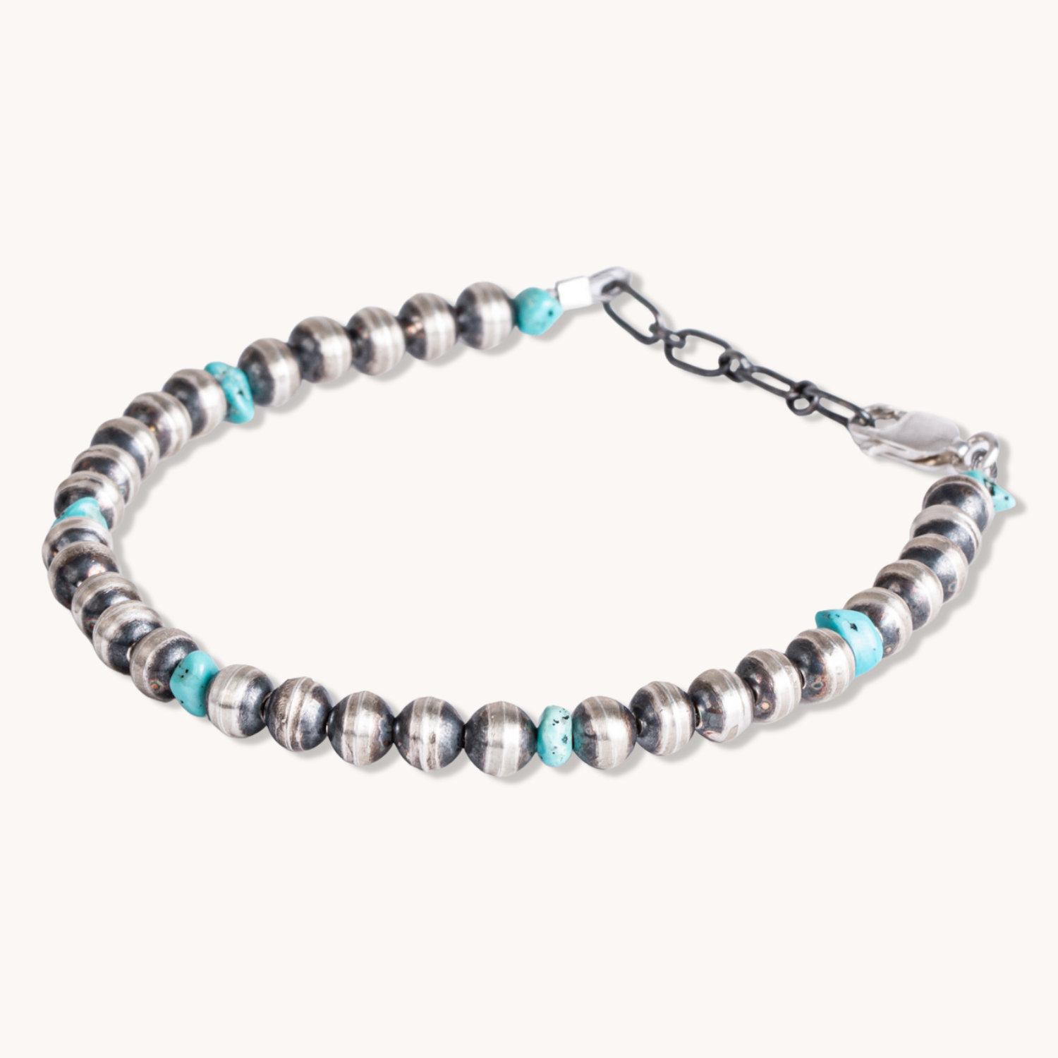 The Desert Blossom Turquoise Classic Pearls Bracelet is the perfect accessory to bring a touch of minimalistic elegance to any outfit. This handmade bracelet is crafted of authentic turquoise beads and our desert pearls, an homage to sterling silver Navajo beads, creating a timeless piece of jewelry that'll last for years.