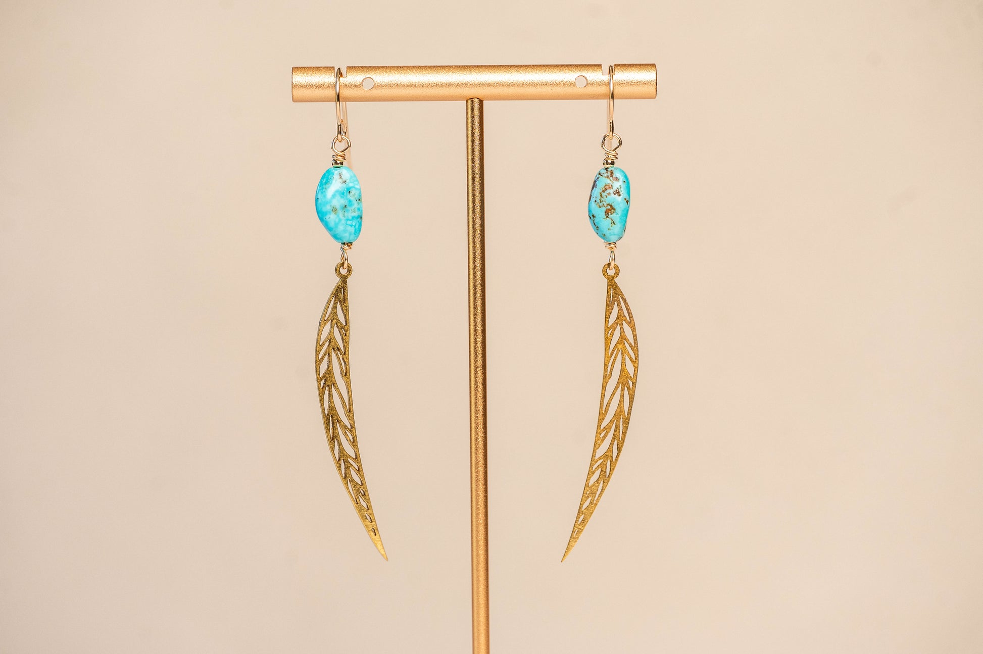 Elevate your jewelry collection with these exquisite brass feather earrings, featuring authentic Arizona turquoise gemstones that deliver undeniable Southwestern charm. The natural beauty of genuine turquoise—with its distinctive color variations and timeless appeal—pairs perfectly with intricately crafted brass feathers that frame your face with elegance. These aren't just earrings; they're a statement piece that transforms any outfit while celebrating artisanal quality. Invest in accessories that tell a story and reflect your refined taste.