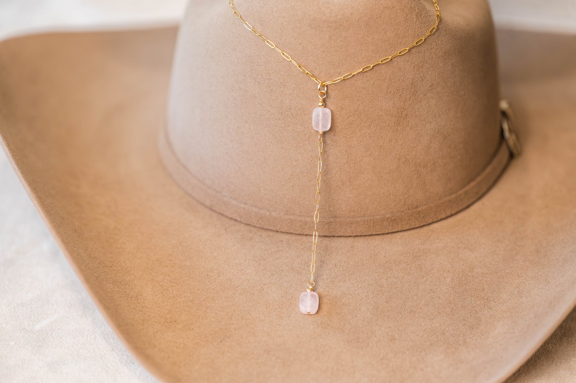 Necklace Rose quartz Lariat Gemstone -14K GF