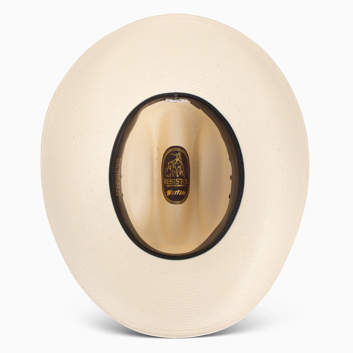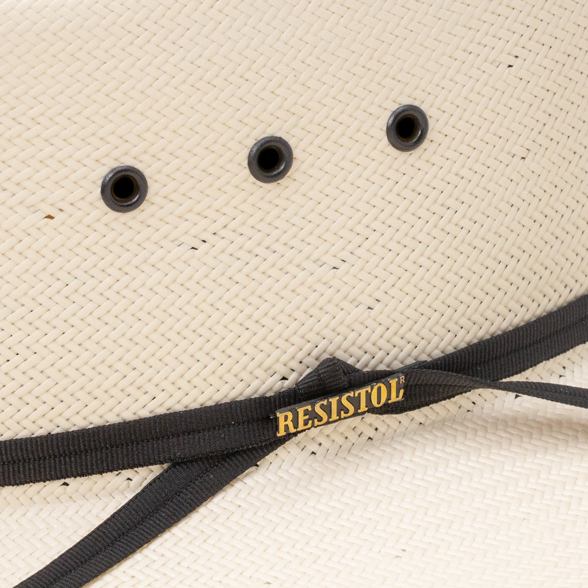 Painstakingly crafted from 10X straw and inspired by the great traditions of the American West, the 10X Cattleman in Natural is a proud member of our Classics Collection. This top-of-the-line hat has a 4” brim, a 4 3/8” cattleman’s crown, and a leather sweatband. The crown has eyelets, and the black ribbon hatband is dressed up with a Resistol pendant.