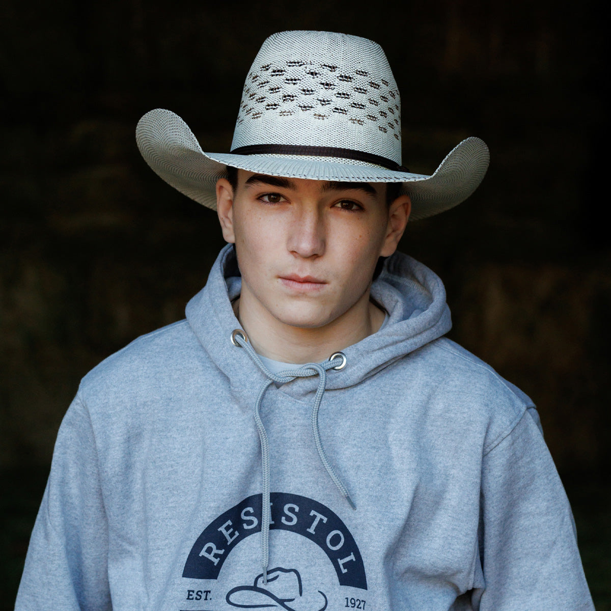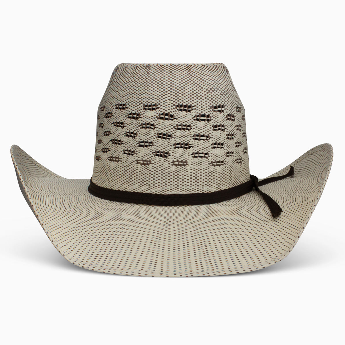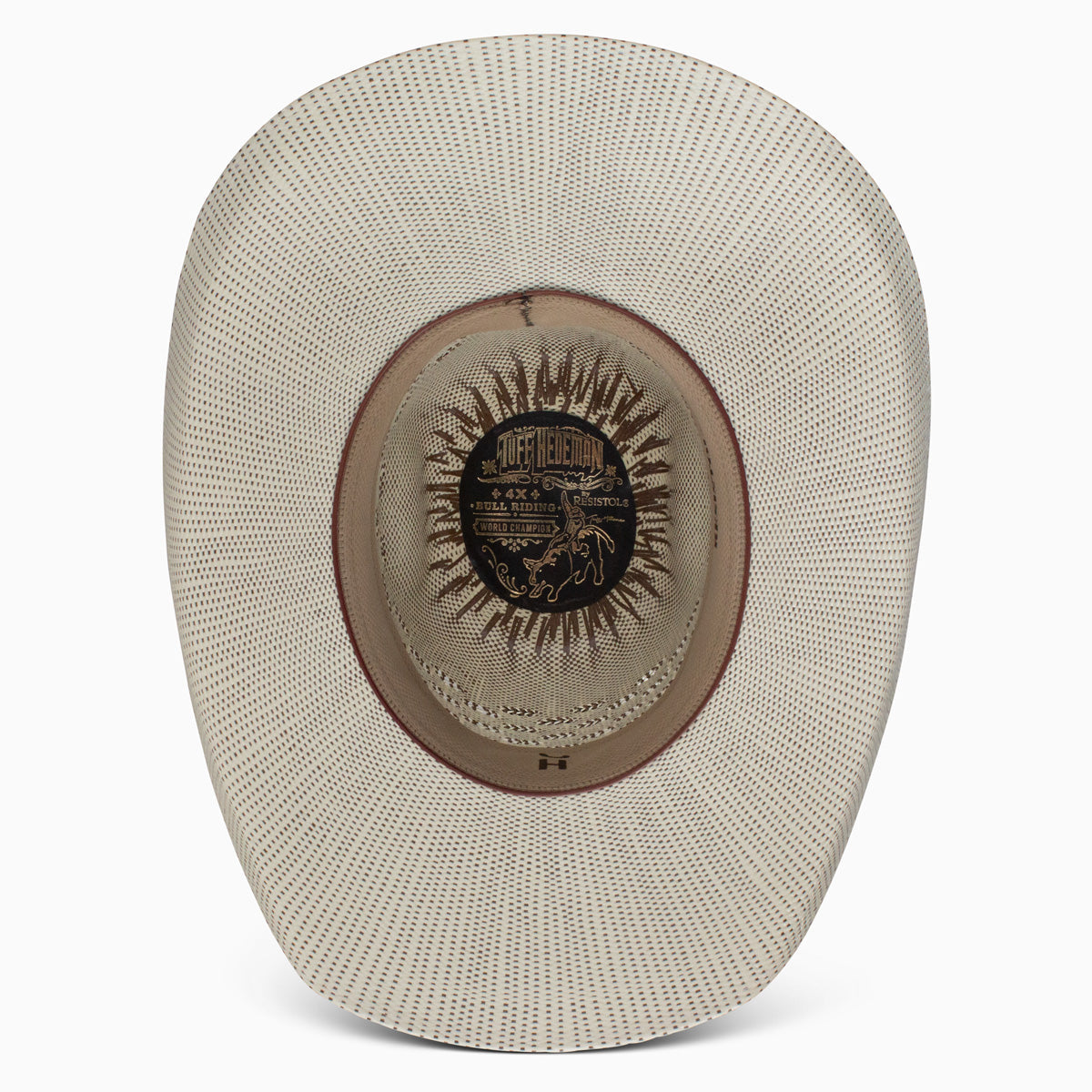 Part of our Tuff Hedeman Collection, the Everett Cowboy Hat is a straw hat with a 5 1/4" rounded brick crown, a 4 1/4" brim, a cloth sweatband, and a simple ribbon hatband. Irregular chocolate-brown stitchwork on the crown gives the Everett a ragged, beat-up look, just the thing for a champion bull rider.