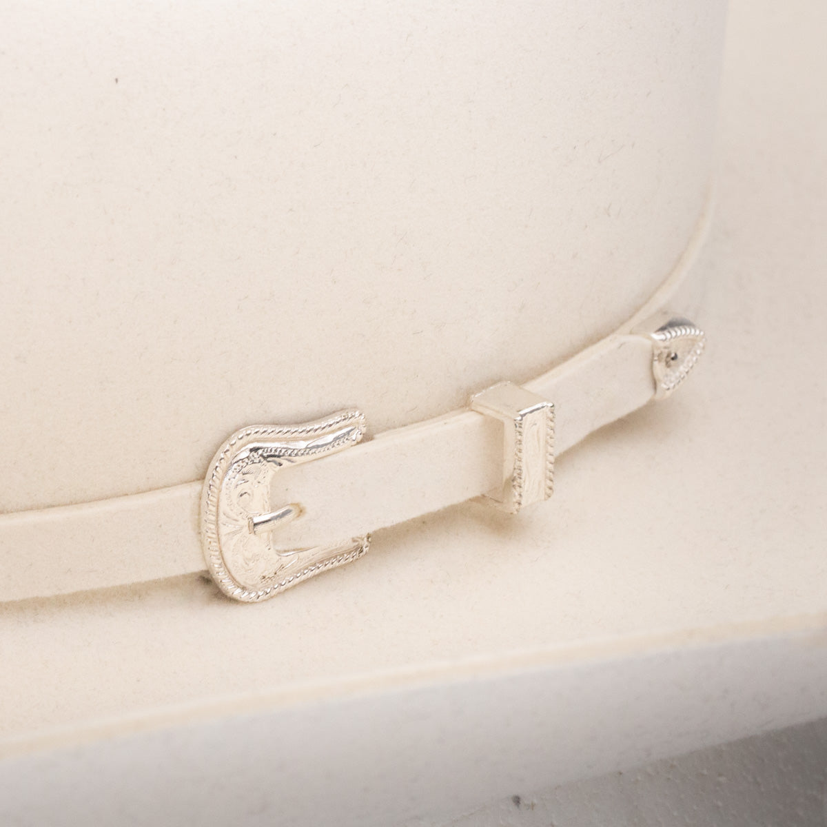Good guys — and great hats — wear white. The Resistol 4X Pageant Cowboy Hat in White is a showstopper of a wool hat with a 4 5/8” cattleman’s crown, a 4” brim, and a leather sweatband. The matching white hatband with a traditional silver buckle gives the Pageant a crisp, heroic look.