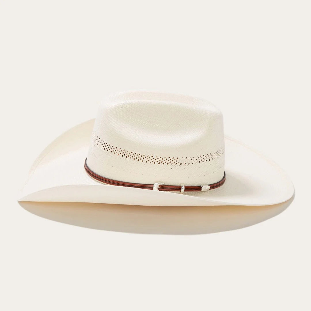 The Rincon 10X Straw Cowboy Hat is constructed of 10X quality straw and features a fully vented cattleman crown, dri-lex interior sweatband and a tooled leather hat band with 3-piece silver toned buckle accent. 10X Quality Straw. Made in USA.